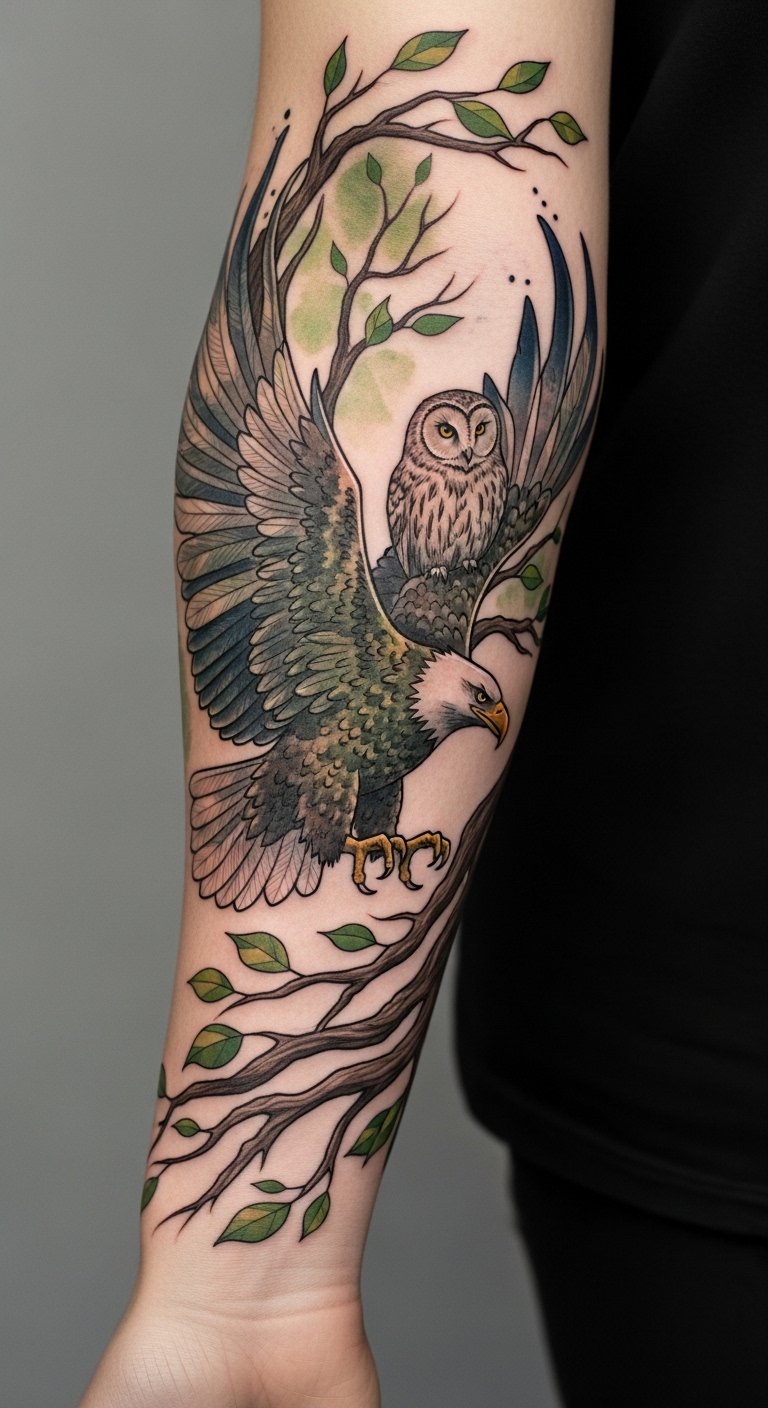 While you explore the domain of tattoo artistry, animal motifs emerge as powerful symbols that connect you with the natural world. Each creature carries deep animal symbolism, reflecting your spirit and values. Imagine a soaring eagle for freedom or a wise owl for knowledge, embracing nature’s essence. These designs not only celebrate wildlife but also forge a profound nature connection, inviting you to express your wild side. The design blends the eagle’s dynamic motion and the owl’s calm watchfulness to symbolize freedom tempered by wisdom; emotionally it evokes empowerment and grounded serenity, suitable for a forearm placement where the flowing branches wrap the arm and the focal eyes sit near the inner forearm for intimate viewing.