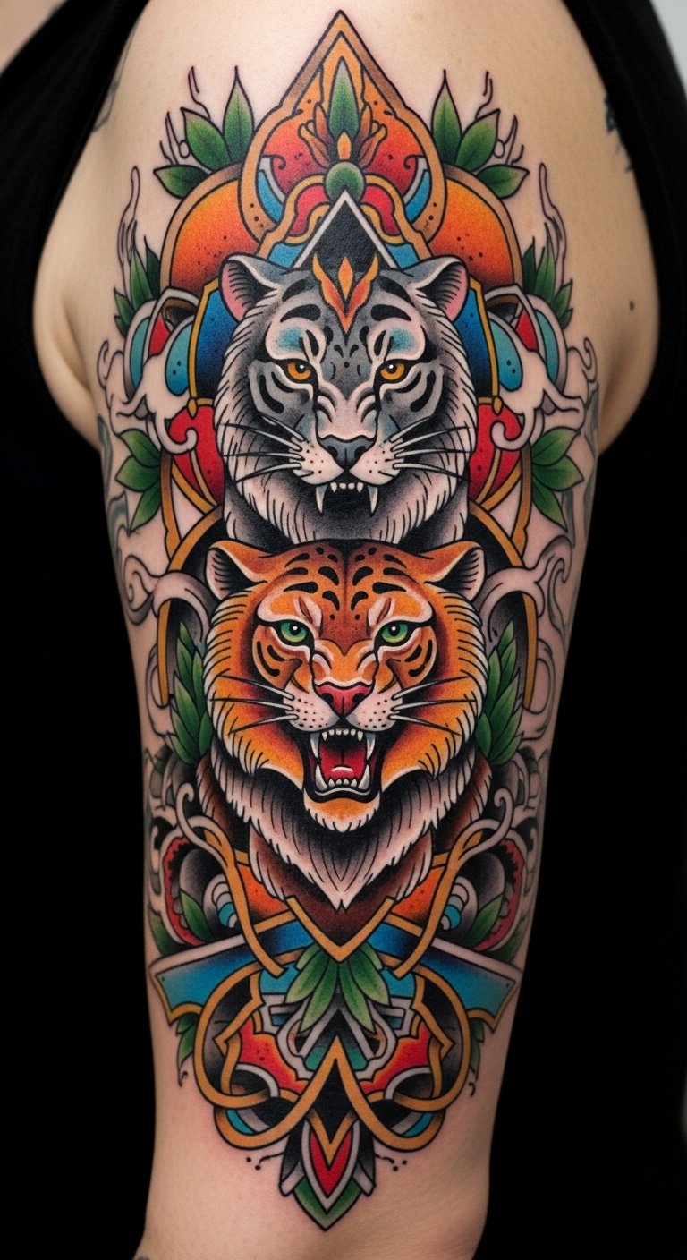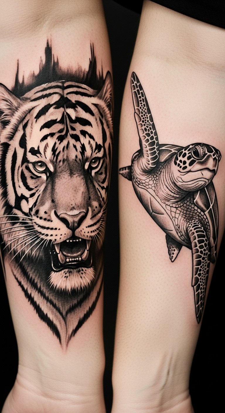 Ideal placements: shoulder-to-sleeve for the tiger for visibility and power, forearm or calf for the turtle for movement and storytelling; both invite conversation and act as wearable calls to conservation.