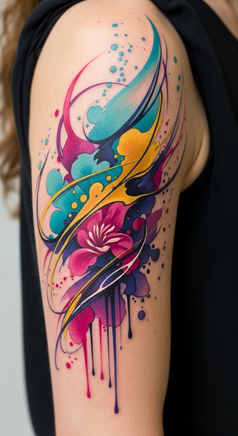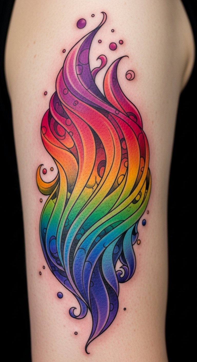 The flowing composition evokes movement and personal growth; place it along the forearm or wrapping the shoulder where the motion complements natural anatomy, making the colors appear to shift with your movements.