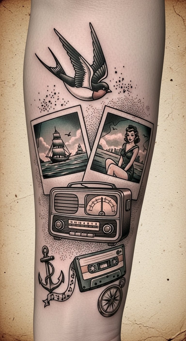 These tattoos celebrate your journey, letting your freedom shine through each meaningful piece. This composition ties each token of memory together: the swallow for safe returns and freedom, the radio and cassette for songs that shaped you, Polaroids for frozen moments, and nautical icons for guidance.