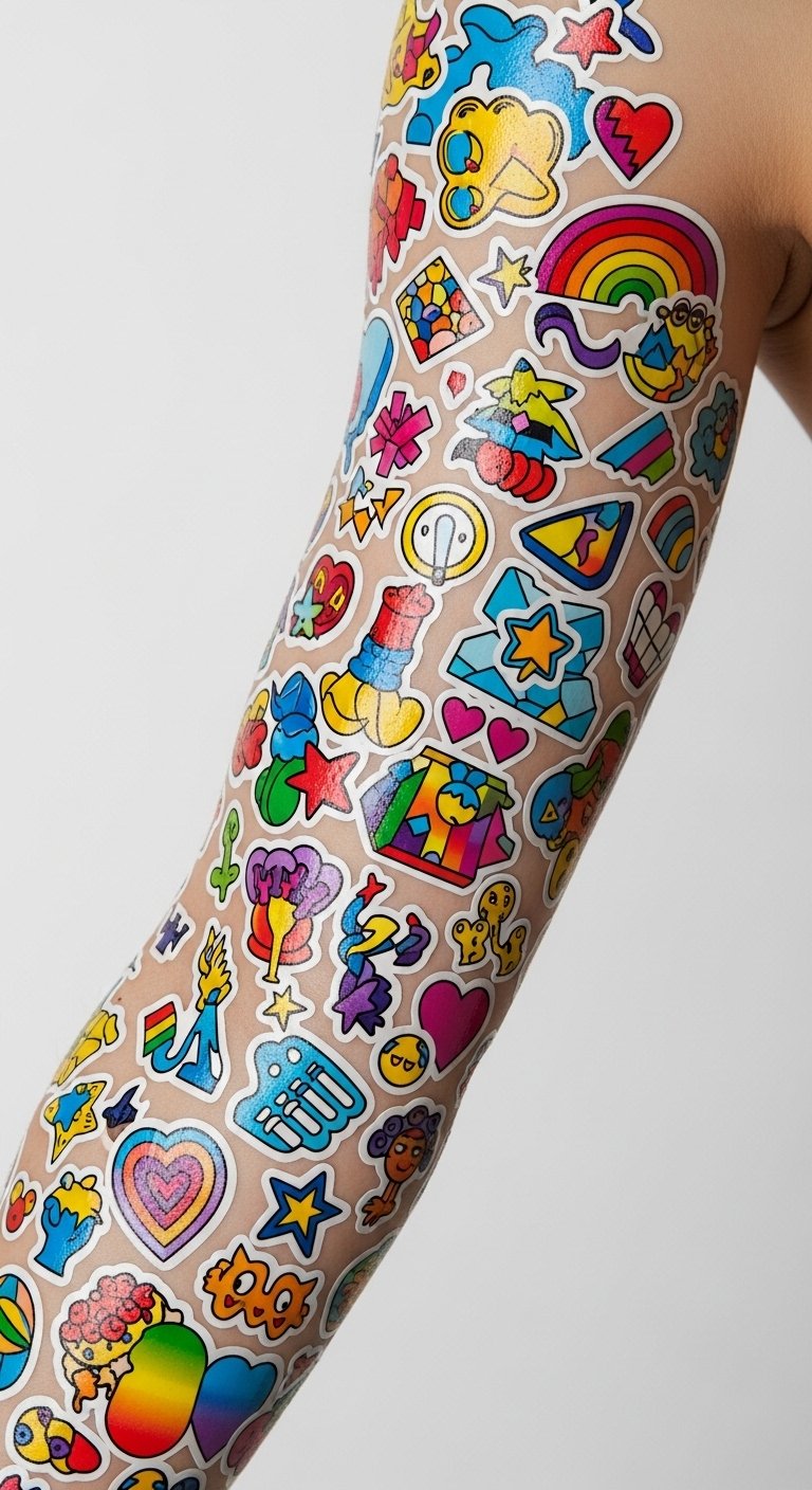 This tattoo concept layers sticker-like individual motifs—bright florals, tiny animals, playful icons, and abstract color swatches—arranged as a sleeve that reads like a collage; symbolism comes from each small piece representing memories, values, or moods, the overall emotion is joyful and expressive, and placement flows from shoulder to wrist with negative-space gaps to preserve the sticker aesthetic and allow future additions.