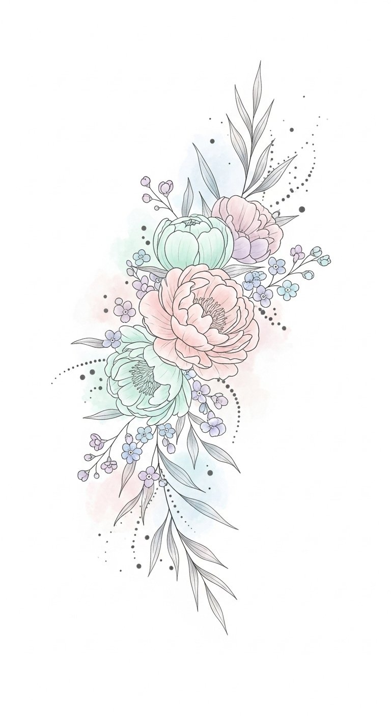 This design concept symbolizes gentleness, renewal, and personal freedom—peonies for compassion and honor, forget-me-nots for lasting memories, and vines for growth and connection—rendered in pastel tones to convey vulnerability and quiet confidence.