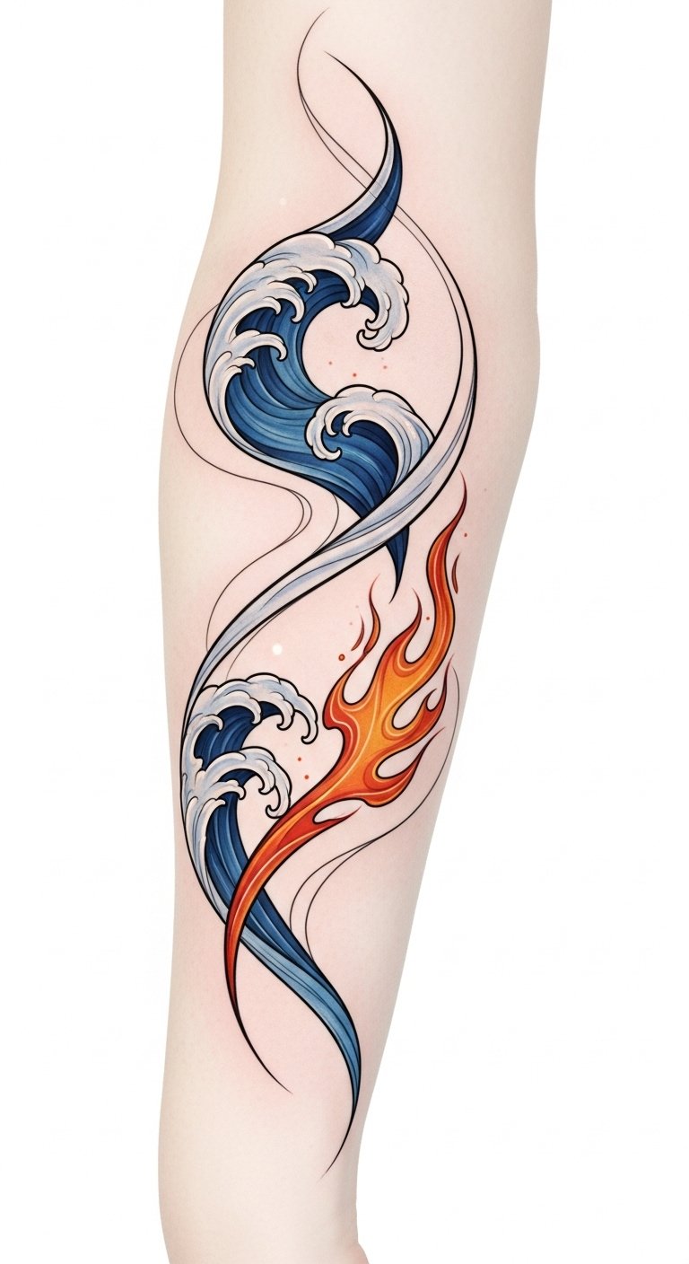 Whether it’s a swirling wave or a dancing flame, each tattoo tells a story of vibrant energy, reminding you to celebrate the beauty of constant motion in your journey. The intertwined wave and flame symbolize balance between calm and passion, evoking resilience and continuous change; placed along the forearm or ribs, the piece moves with the body, creating an emotional sense of liberation and forward momentum.