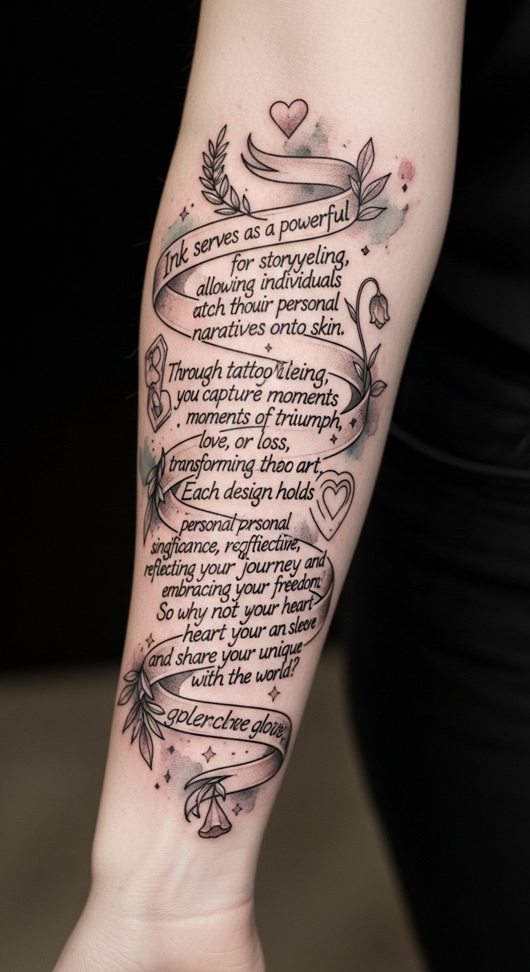 The design symbolizes the literal act of carrying your story on skin: the scripted ribbon represents continuous narrative flow while the accompanying icons mark key emotional beats—victory, affection, mourning—so the piece reads like a personal timeline.