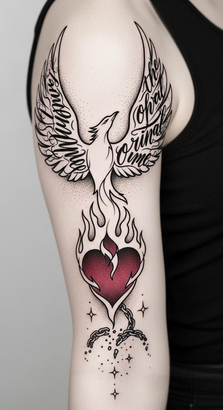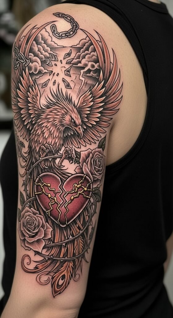 This tattoo pairs the phoenix’s rebirth with thorned vines and roses to symbolize pain intertwined with growth; the cracked heart mended with golden threads evokes resilience and healing (kintsugi-inspired), while shattered chains and clearing storm clouds represent liberation from hardship.
