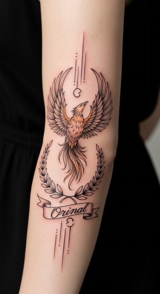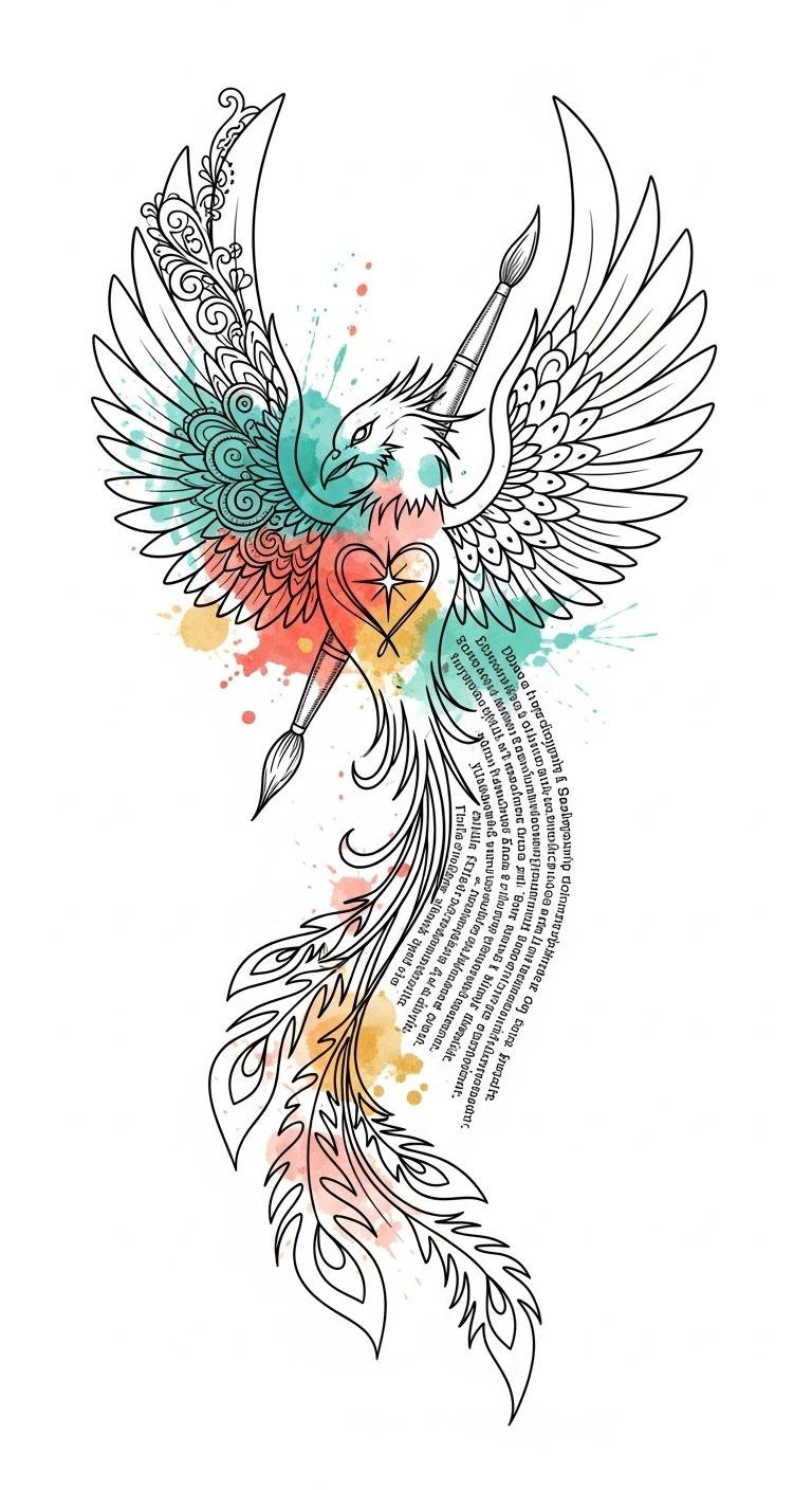 The design pairs the mythic phoenix with an artist’s tool to symbolize rebirth through creativity and the courage to break from the norm; the glowing star at the heart represents inner light and authenticity, while watercolor splashes convey expressive freedom and emotional depth. Filigree and dotwork add delicacy and individuality, making the piece feel both bold and intimate. Ideal placements are the forearm for public affirmation or the ribcage for a more personal reminder; the scale allows the full sentence to flow along the tail so the wearer carries the complete message as part of the artwork.