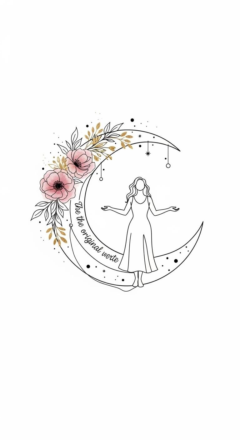 This design uses the crescent as a cradle of personal growth, the woman’s open-armed stance symbolizing acceptance and empowerment, and the blooming florals and warm watercolors to evoke inner warmth and resilience.