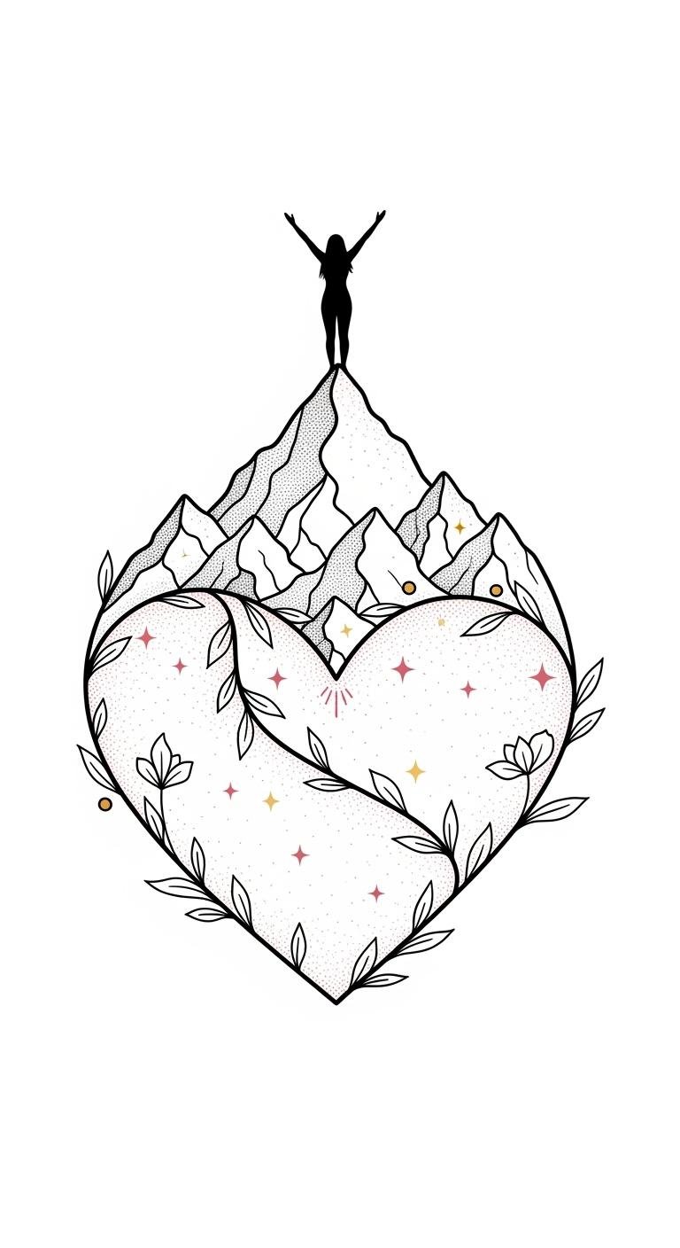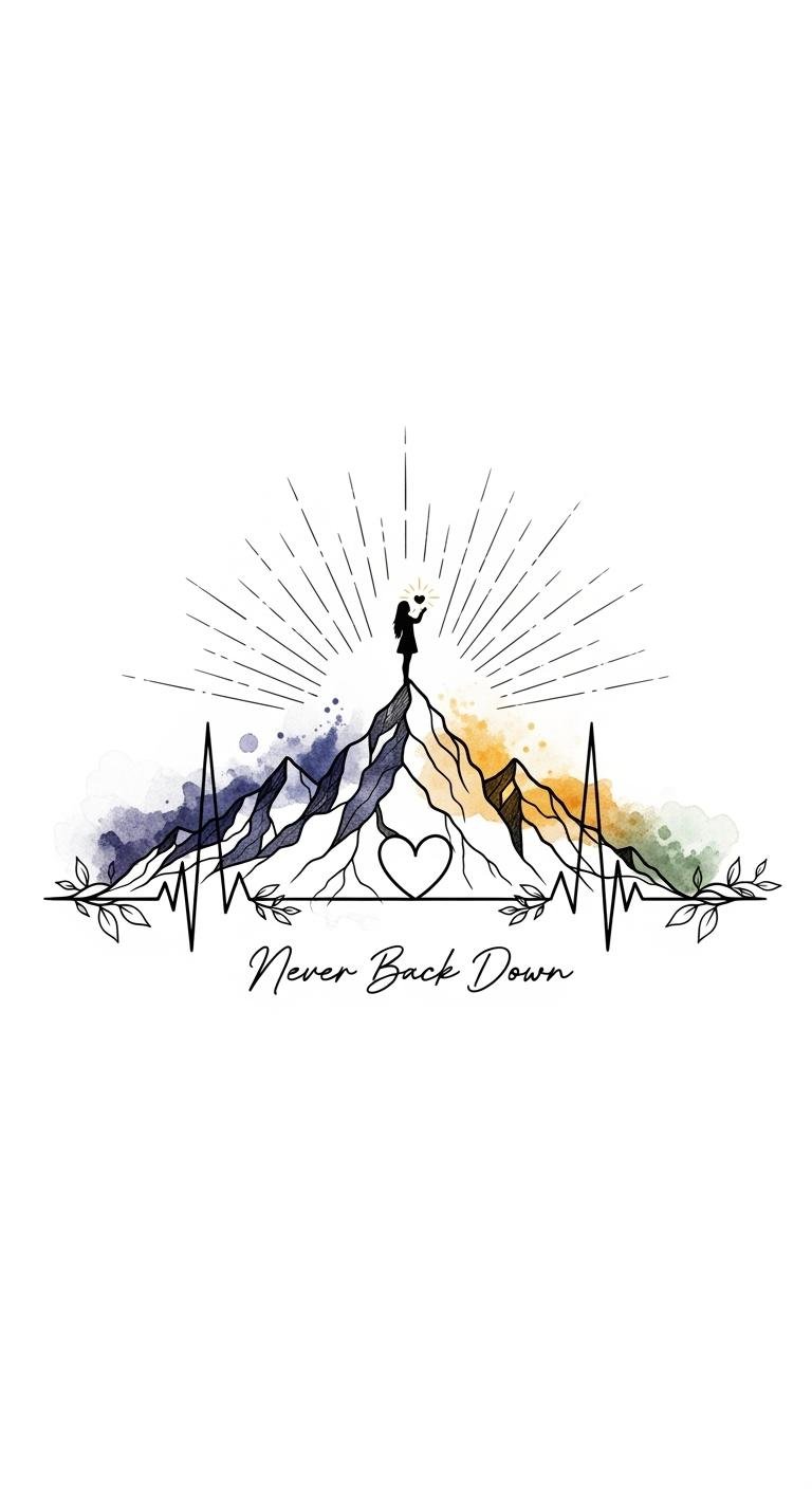 The mountain-heartbeat motif symbolizes the climb of self-discovery and the steady pulse of inner strength; the glowing heart and rays convey hope and courage, vines represent growth and connection, and the phrase anchors the piece as a personal mantra.