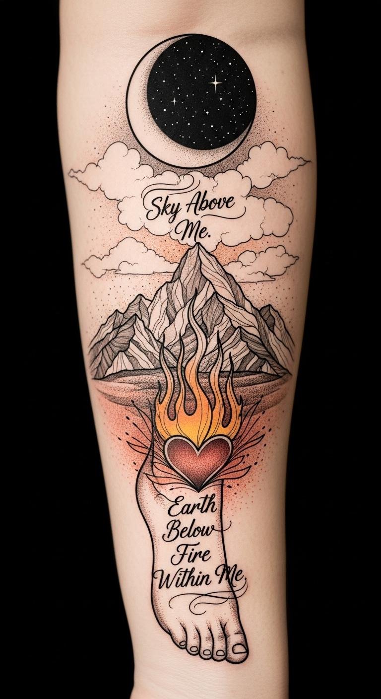 Strength flows from a profound connection to the world around you, grounding you in the earth beneath your feet and inspiring you to reach for the sky above. “Sky Above Me. Earth Below Me. Fire Within Me” symbolizes the elemental balance you seek. Your inner strength ignites through nature connection, fostering personal empowerment and spiritual resilience, while fire energy fuels your grounded presence in the journey of life. This design balances serenity and power: the sky evokes aspiration and calm, the earth conveys stability and rootedness, and the fire represents passion and inner transformation. Emotionally it reads as centered confidence and quiet courage; place it along the forearm for visibility and daily reminder, or down the spine for a more private, grounding statement.