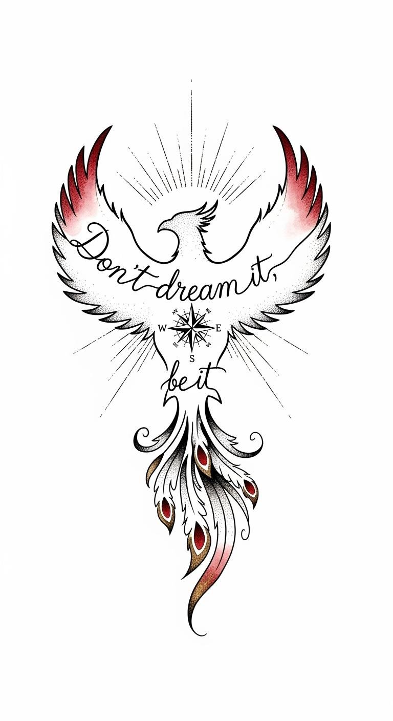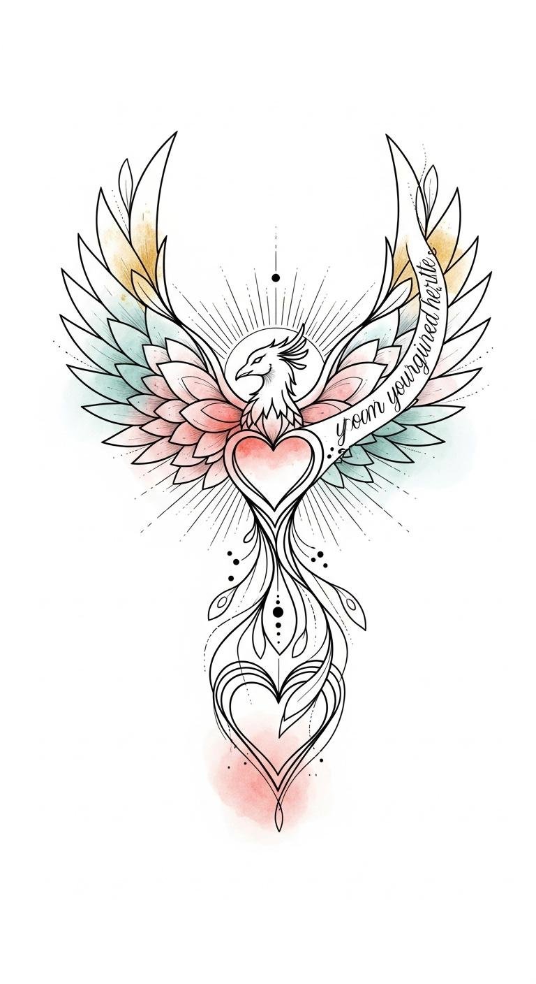 The phoenix symbolizes rebirth and active transformation, the compass rose marks purposeful direction, and the rising rays express momentum and hope; watercolor accents add warmth and passion while fine-line execution keeps the design elegant and personal.