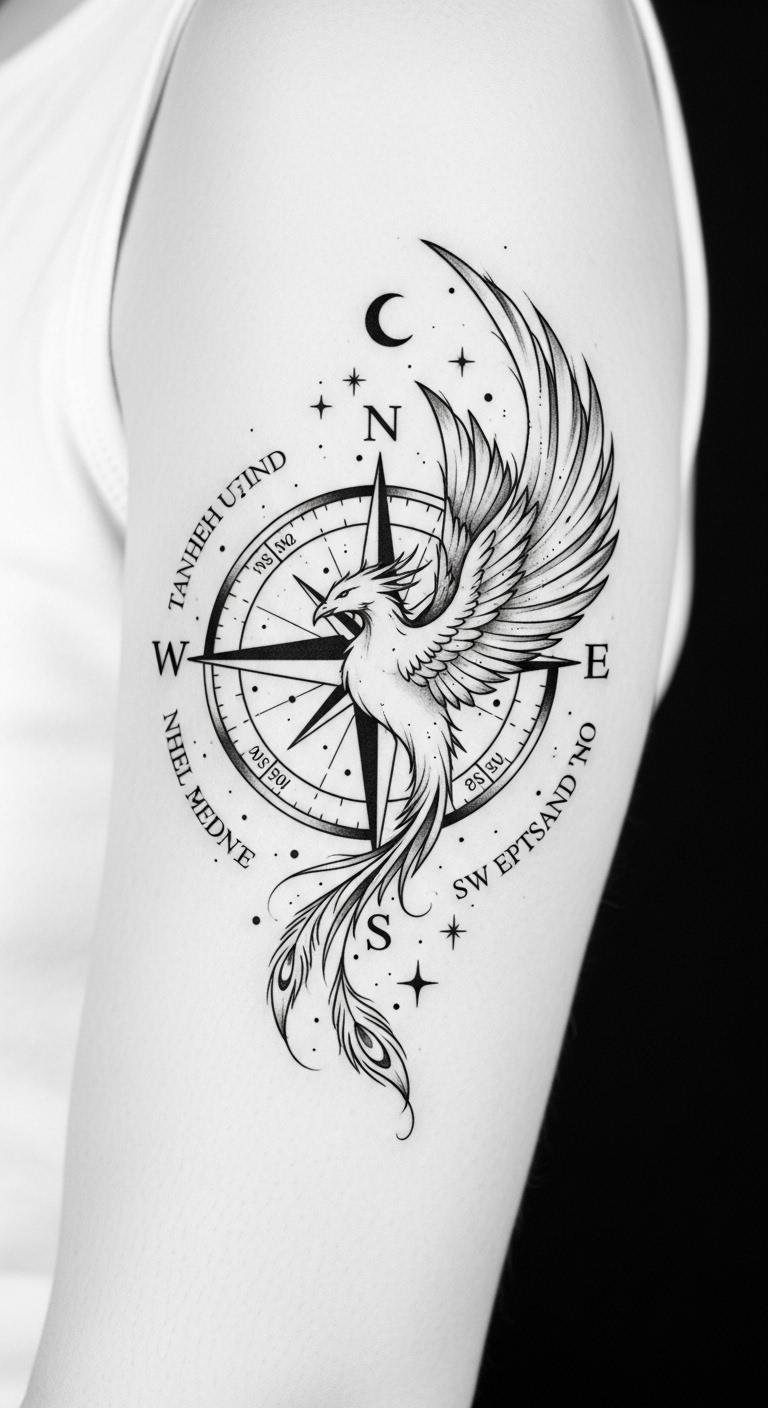 The design uses the compass to symbolize guidance and the phoenix for rebirth and resilience, visually merging navigation and transformation.