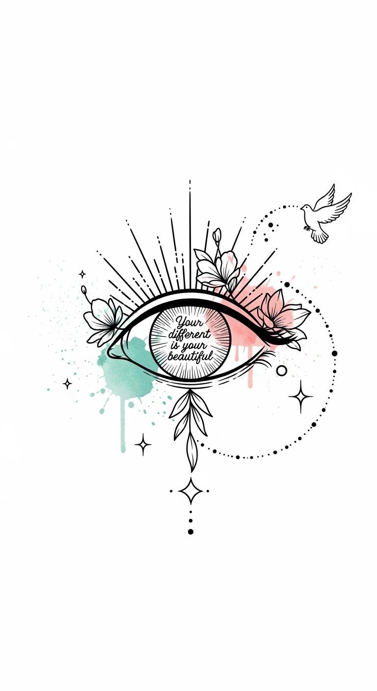 The design symbolizes self-awareness (the open eye) and the radiating integration of individuality (rays transforming into diverse flowers and geometry), while the tiny script in the iris anchors the message internally; watercolor accents add tenderness and boldness simultaneously.