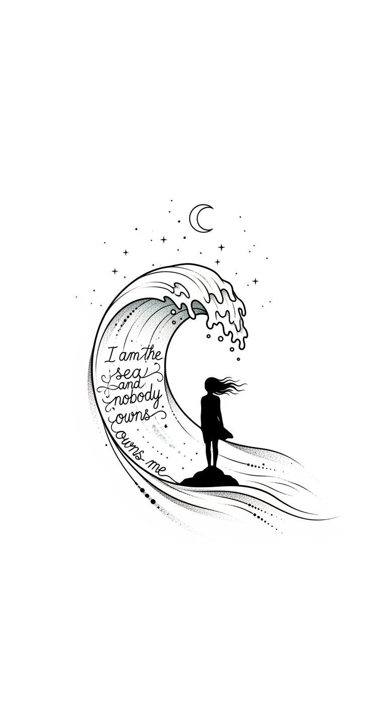Fine-line and dotwork evoke delicacy and depth, matching the emotional tone of introspection and liberation. Ideal placement is along the inner forearm, wrist, or ribcage where the curve of the body complements the wave’s flow and allows the script to read naturally when viewed; sizing can be adjusted for a personal, intimate statement.