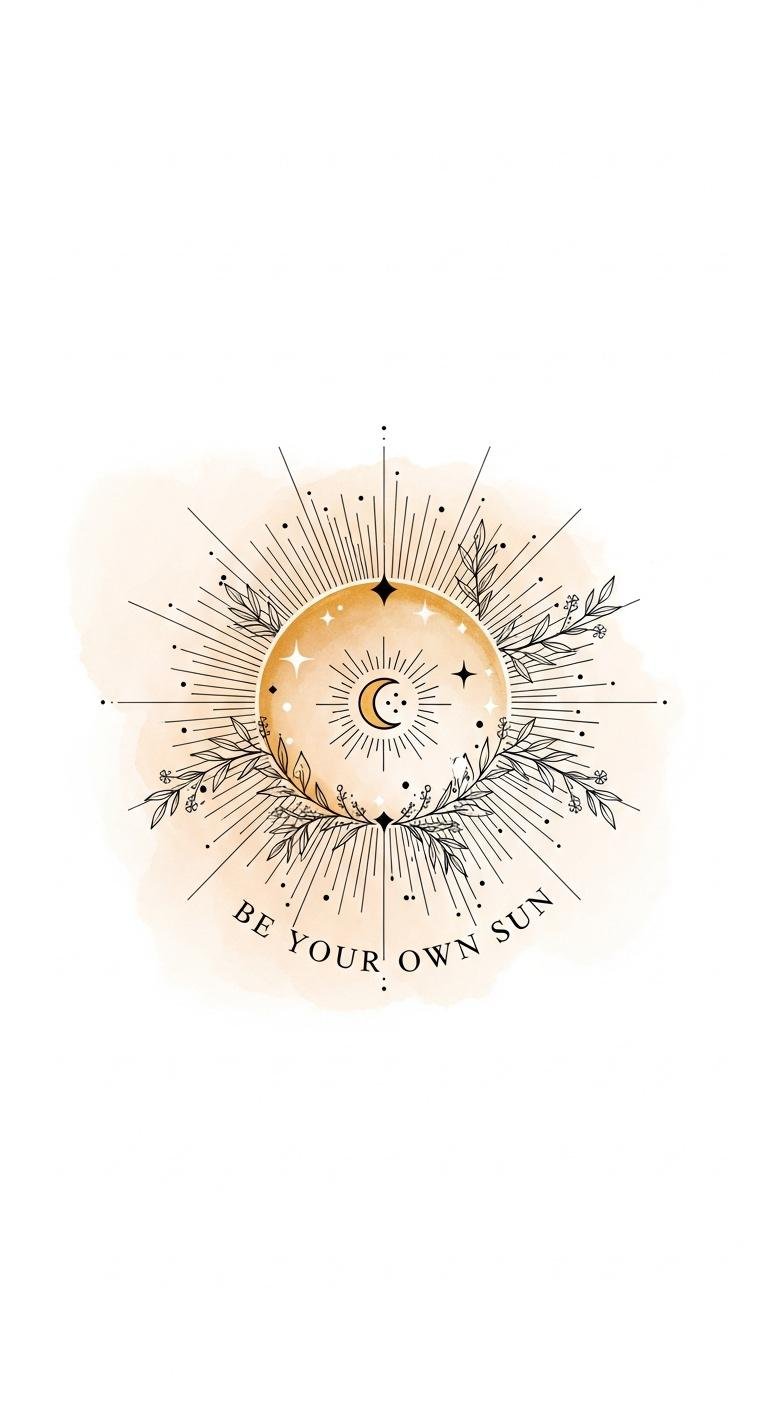 The design symbolizes inner radiance and self-reliance: rays turning into vines represent growth springing from personal strength, stars and crescent nod to guidance and quiet confidence, and the warm palette evokes warmth and empowerment.
