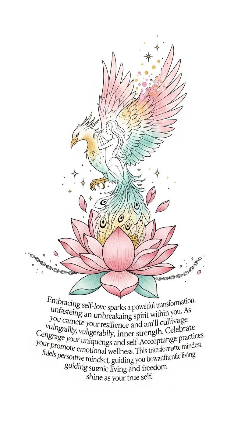 In this design the phoenix symbolizes rebirth and resilience while the heart-shaped flame anchors the concept of fierce self-love; the phoenix’s wing-feathers subtly incorporate the original text as delicate script to make the words part of the image without altering them.