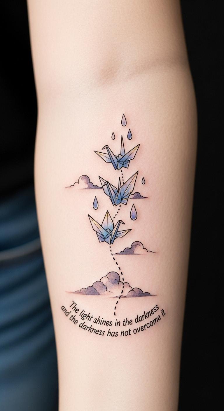 The design pairs vulnerability and liberation: teardrops symbolize release and cleansing, transforming into paper cranes that represent healing, hope, and the ability to rise. Watercolor hues convey emotion and softness while gold accents highlight emerging strength.