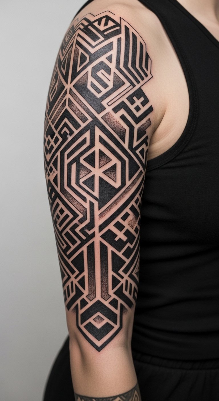 This concept blends clean, interlocking polygons and negative-space lines to symbolize balance between structure and personal freedom; crisp triangles and hexagons represent resilience and community while tapered lines suggest movement and individuality. Emotionally it speaks to confidence and thoughtful intention—ideal for someone seeking a modern, assertive aesthetic. Placement options include the forearm or upper back for visibility and flow, or behind the ear and along the rib for a subtler, intimate statement that follows the body’s natural contours.