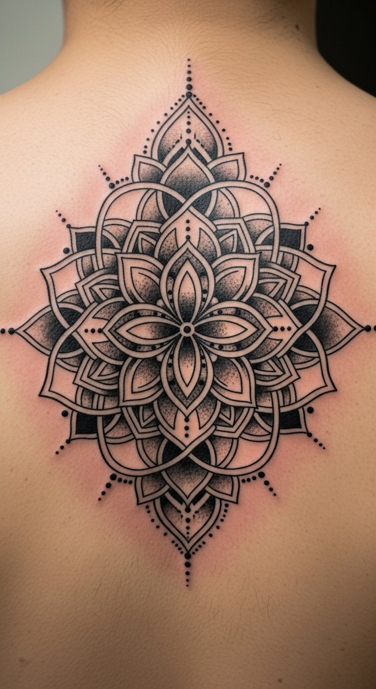 The design concept draws from the original text’s emphasis on detail and spiritual depth: a layered circular mandala beginning with a small lotus center, expanding into concentric rings of filigree, dotwork, and geometric petals, balanced symmetrically to evoke unity and harmony.