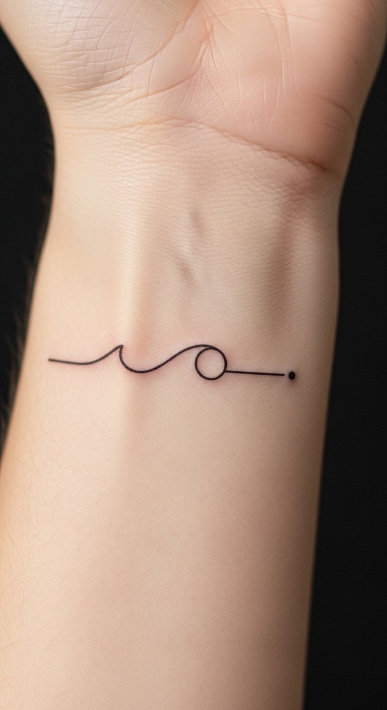 The design uses the wave as motion and resilience, the open circle as openness and continual growth, and the final dot as presence and intention; placed on the inner wrist for intimacy and visibility, it conveys calm confidence, quiet strength, and a mindful reminder each time you glance at it.
