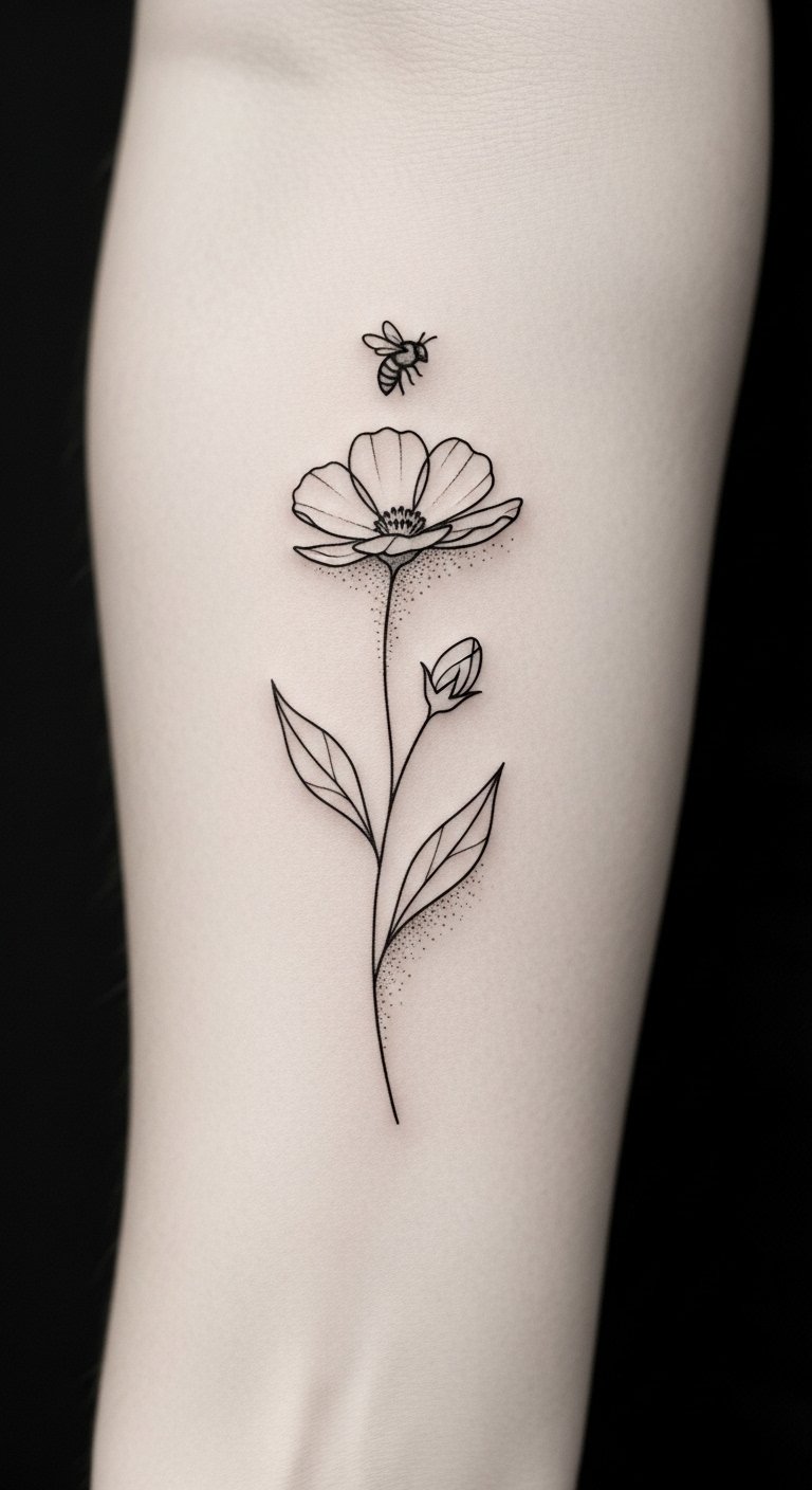 This design echoes the text’s themes of whispering elegance and gentle expression: the continuous line symbolizes personal narrative and individuality, the wildflower represents natural growth and simplicity, and the small bee adds a touch of free-spirited movement.