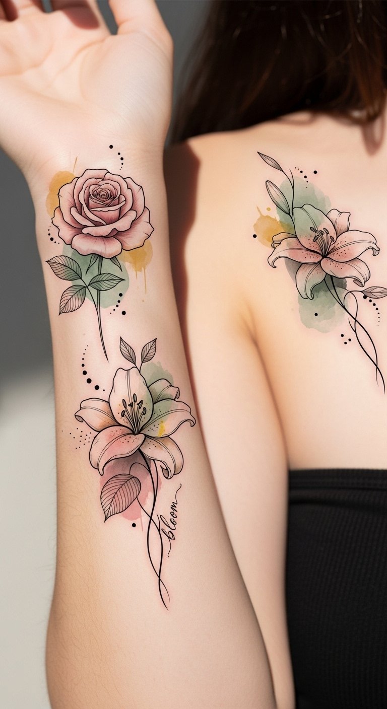 Soft watercolor tones and fine-line details create a sense of intimacy and movement, ideal for placement along the forearm to be seen in gestures or on the shoulder to offer a more private emblem of growth.