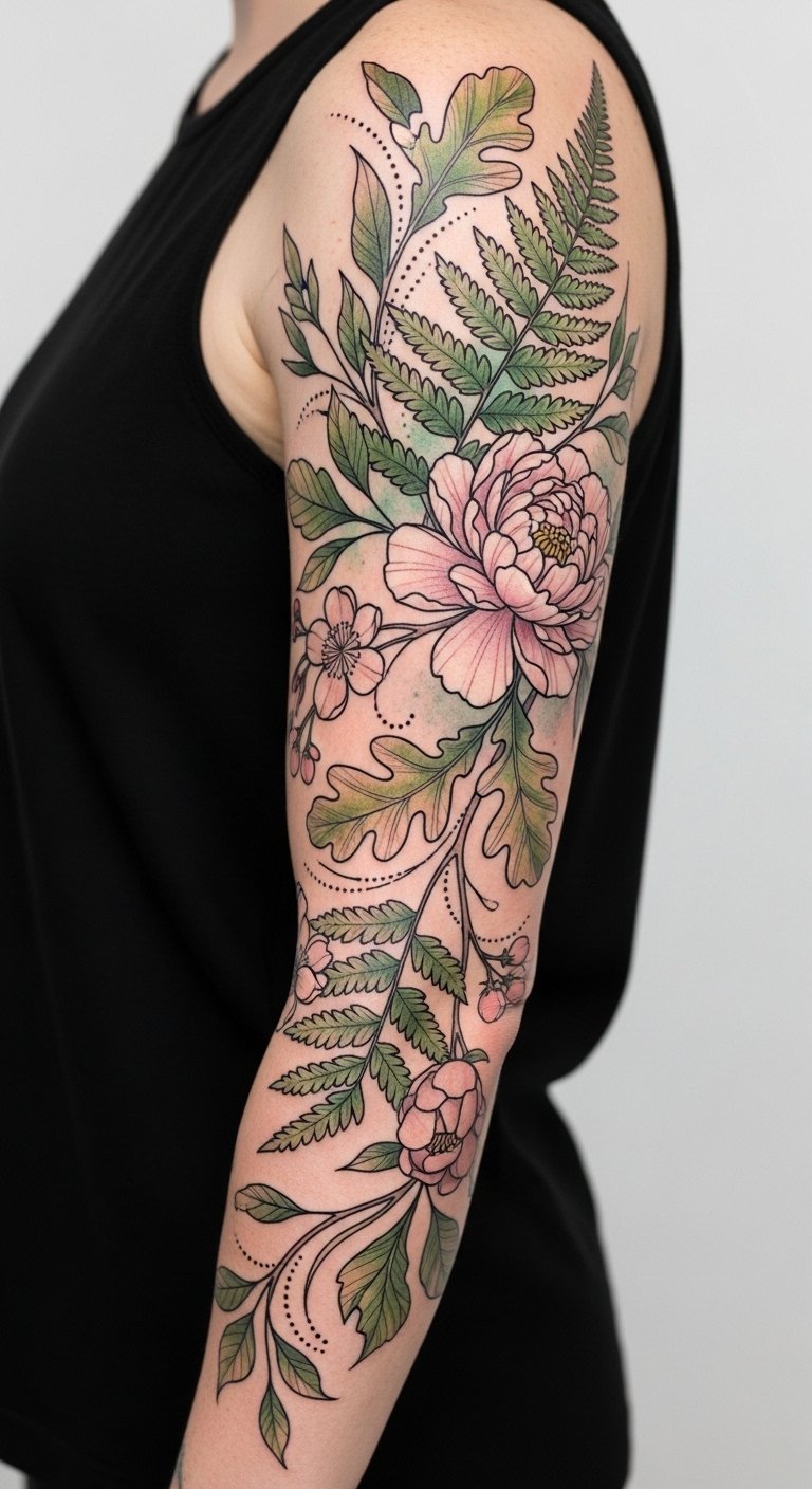 This design symbolizes growth, resilience, and the passage of time—oak for strength, fern for new beginnings, peony and cherry blossoms for transient beauty—evoking calm, renewal, and joyful remembrance; ideal placed as a half-sleeve on the upper arm where the flowing vines complement muscle lines and can be extended later.