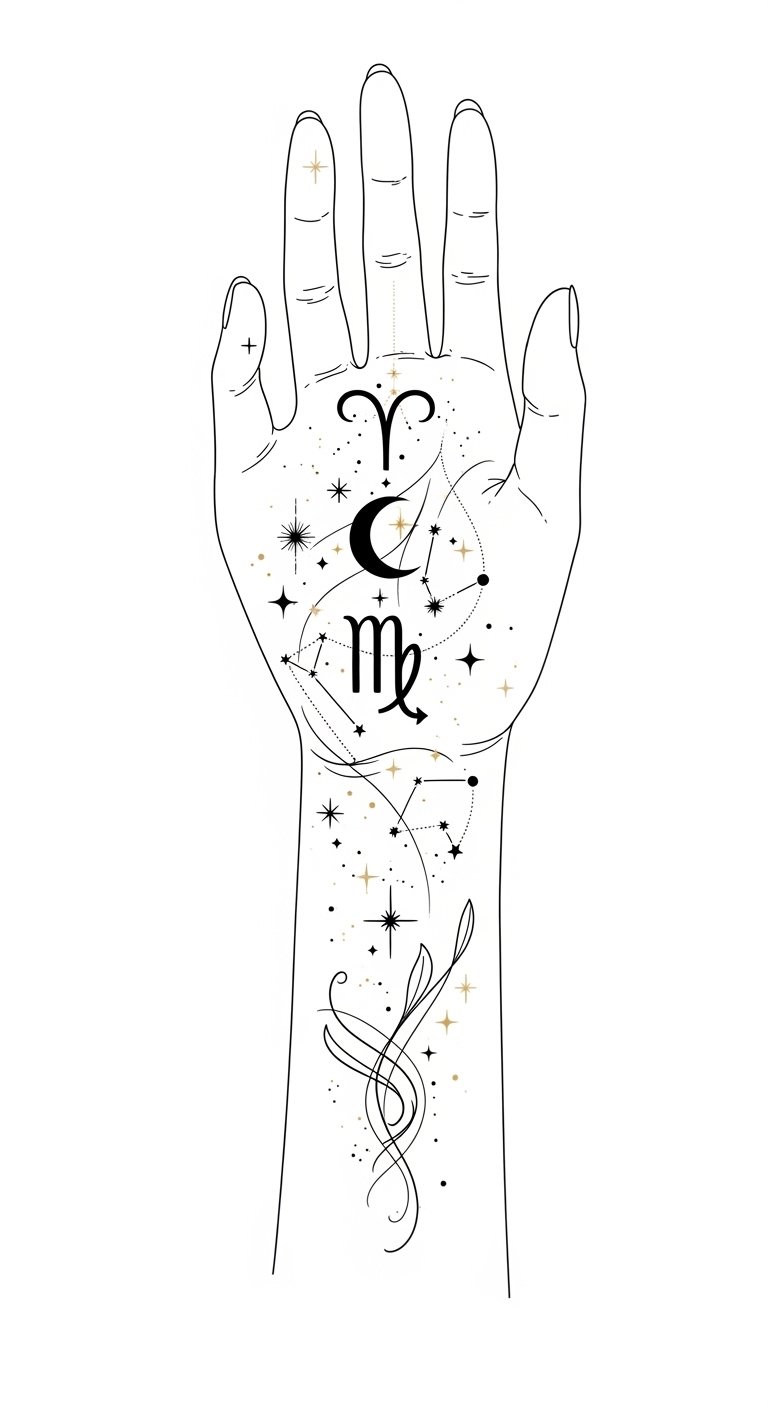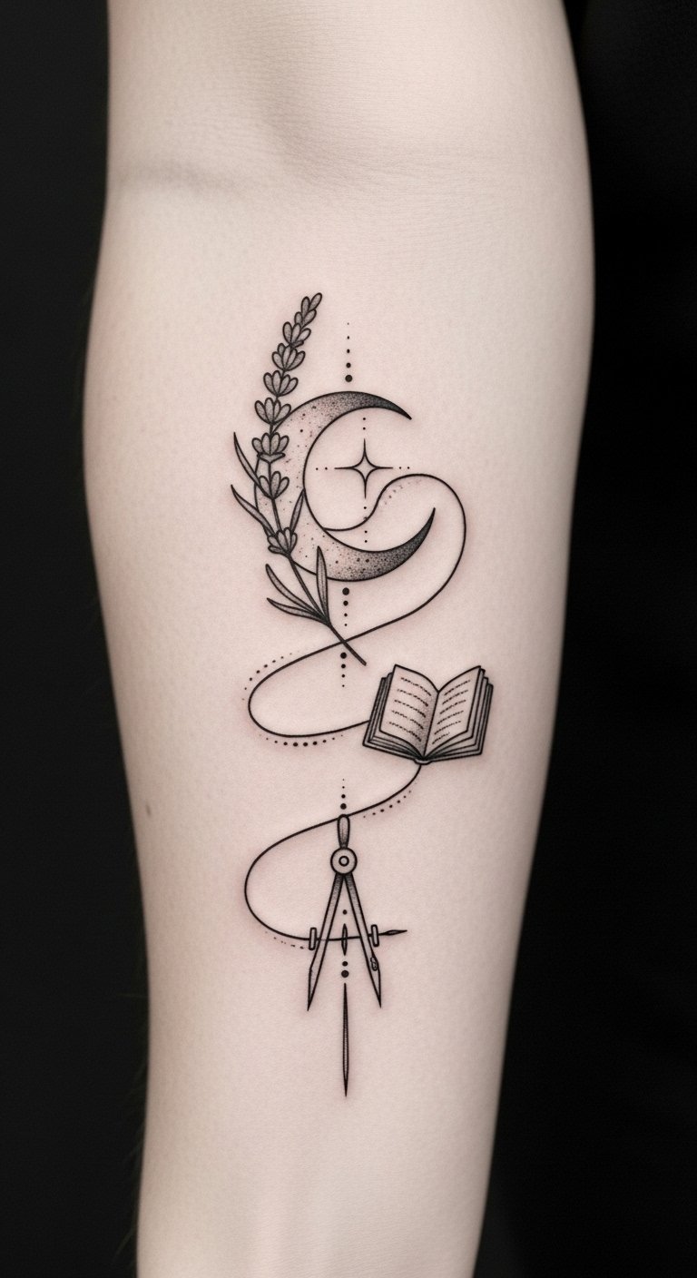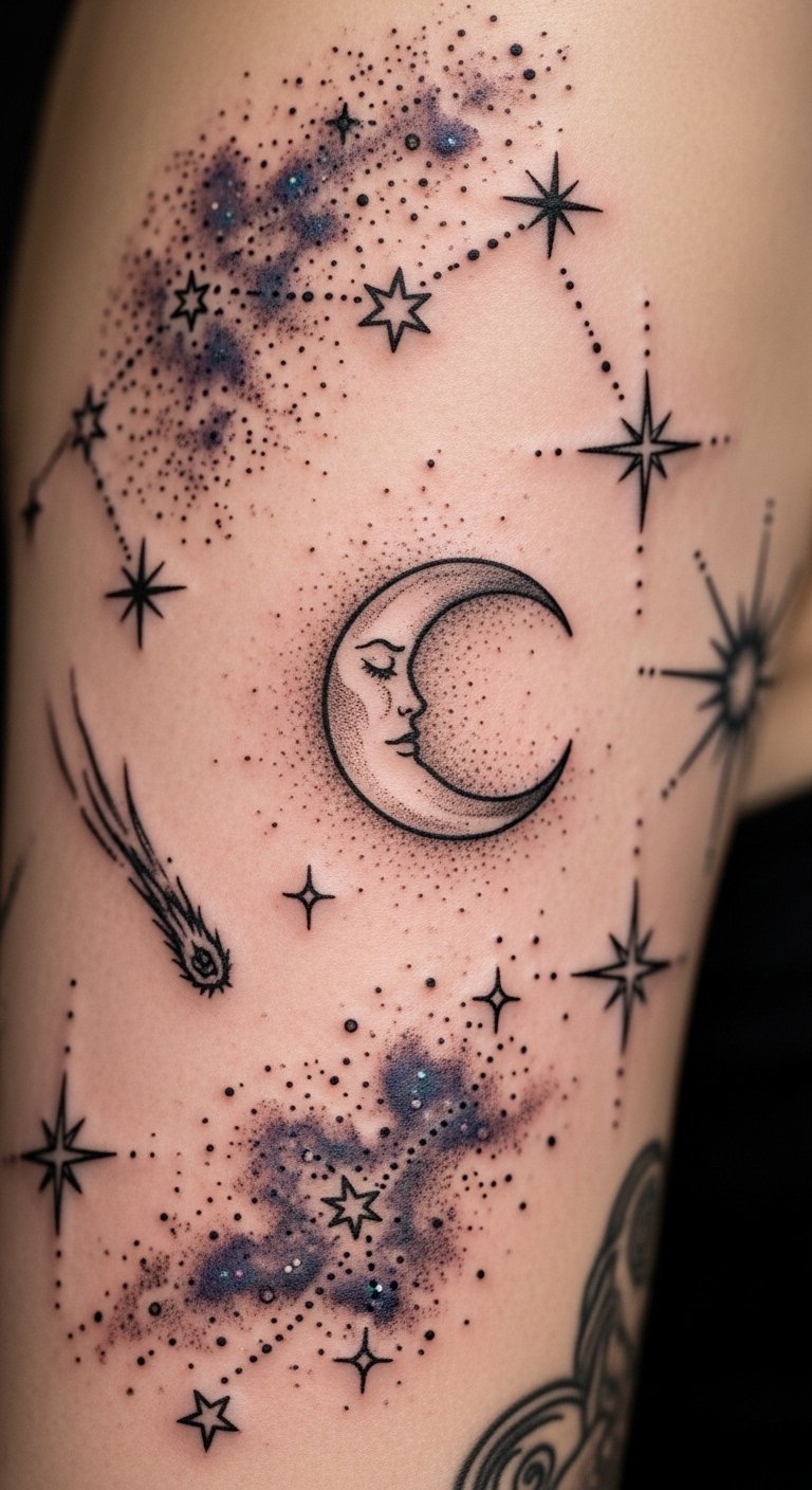 Celestial motifs evoke a sense of limitless possibility and gentle mystery; place a constellation of tiny stars along the collarbone or wrist to suggest curiosity and a quiet, adventurous heart, or ink a delicate crescent moon behind the ear or on the inner forearm to convey serenity and freedom.