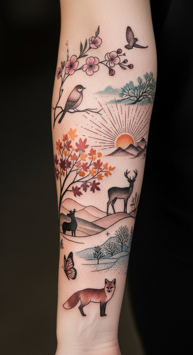 This design symbolizes cyclical renewal and harmony with the environment, evoking calm, rootedness, and spirited freedom; ideal placement is along the forearm or ribcage to allow the flowing seasonal elements to wrap naturally and be shown or concealed as desired.