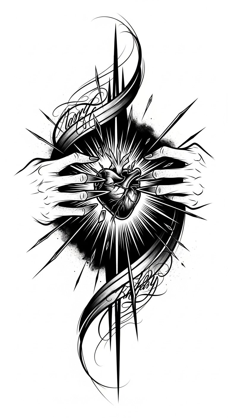 This design centers the radiant heart as a visual core of emotion and personal truth, with shards and rays symbolizing outward-reaching influence and the breaking of boundaries; the graphic boldness evokes confidence and defiance while the script-like brushstrokes add movement and personal narrative.