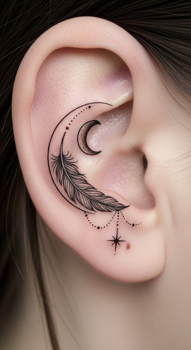 Imagine placing this subtly hidden crescent-and-feather inside the ear where it lightly follows the natural curve, symbolizing protection, intuition, and the gentle freedom of personal truth; the tiny star adds a quiet spark of hope.