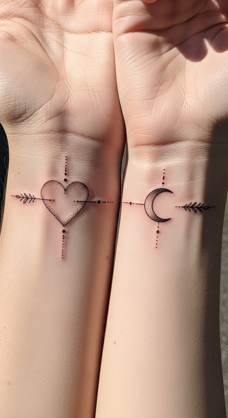 The mirrored heart-and-moon imagery symbolizes mutual support and complementary energies—affection and introspection—evoking warmth, trust, and quiet constancy; ideal placements are inner wrist or inner forearm so the halves align when hands meet, creating an intimate gesture that reads as a single emblem and carries subtle everyday significance.