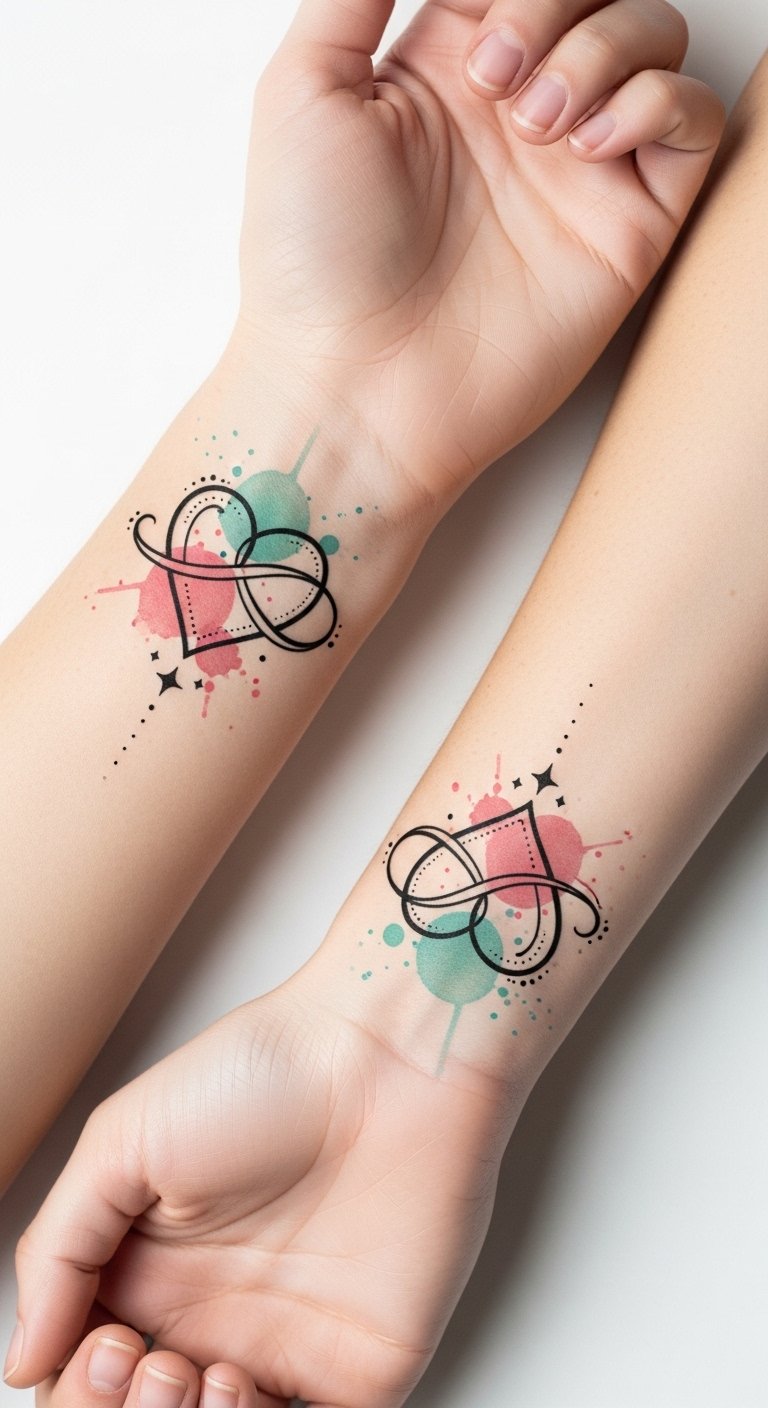 The intertwined hearts with an infinity motif symbolize enduring unity and mutual support; watercolor hues convey individuality within the shared bond, while fine-line details and tiny stars evoke hope and small moments of joy.