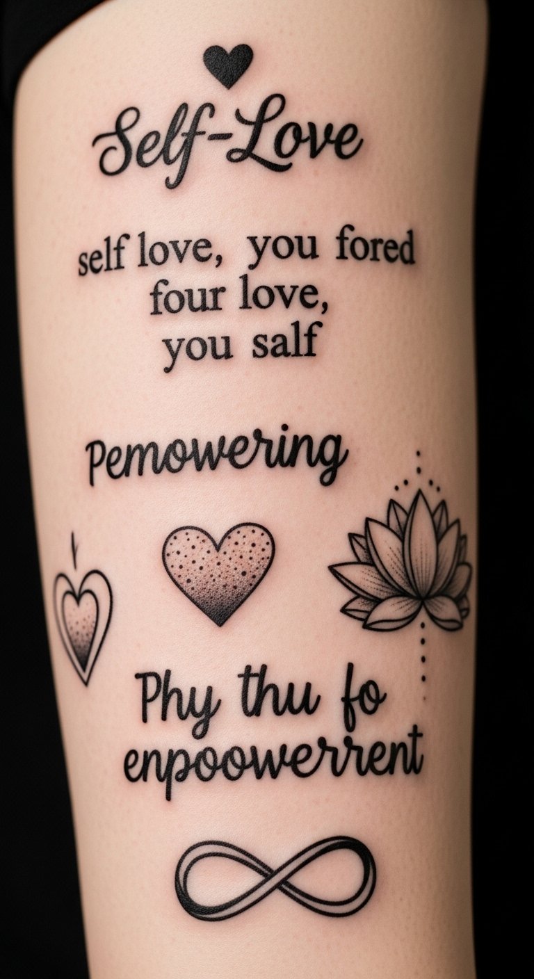 A delicate wrist or ribcage tattoo combining a small open heart cradling a blooming lotus, with a thin infinity sign subtly woven through the stem and a short self-love affirmation in elegant script beneath; soft linework, minimal dot shading, and optional watercolor washes in warm pinks and gentle golds to evoke tenderness and resilience. This design symbolizes continual growth, boundless worth, and the ongoing journey of acceptance; place it where you can choose visibility for daily reminder or concealment for personal quiet strength.