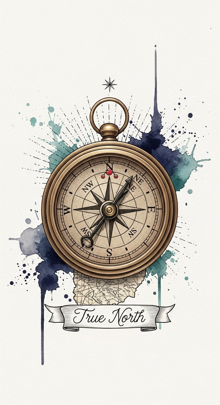 This design combines the solidity of a vintage compass with expressive watercolor to symbolize steady guidance amid emotional currents; the north star and banner add personal affirmation, suitable for placement on the inner forearm for daily visibility or over the heart for deeply personal significance.