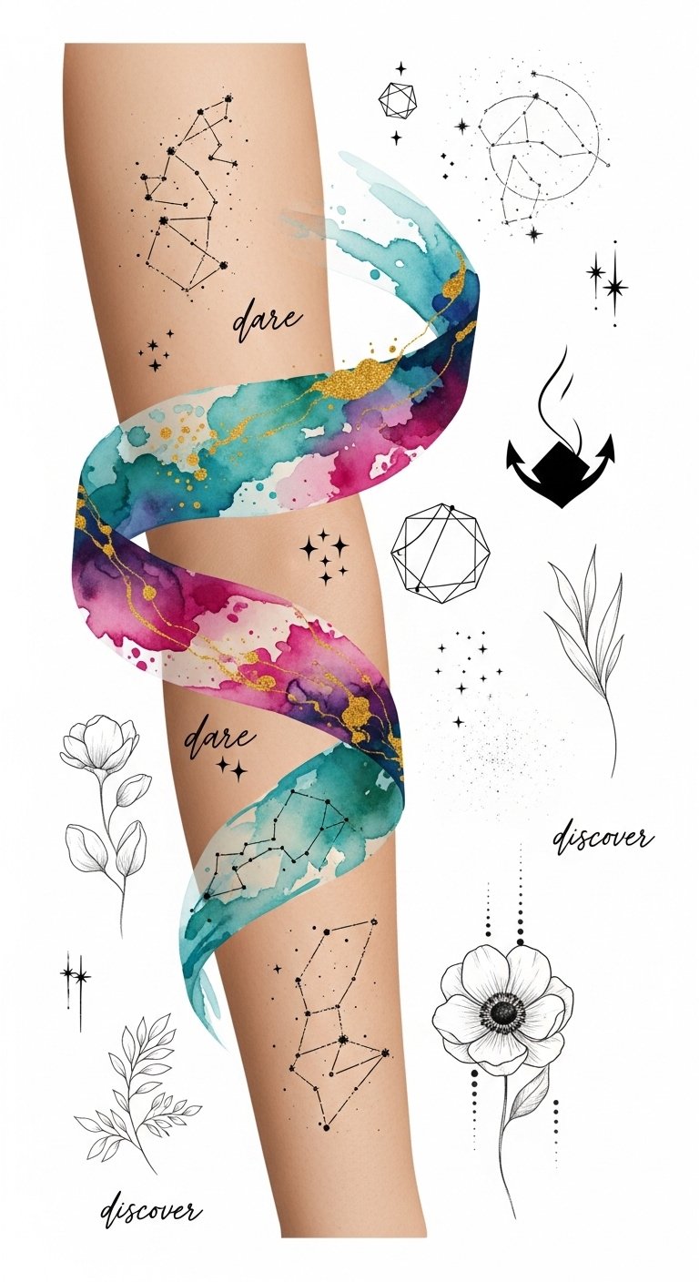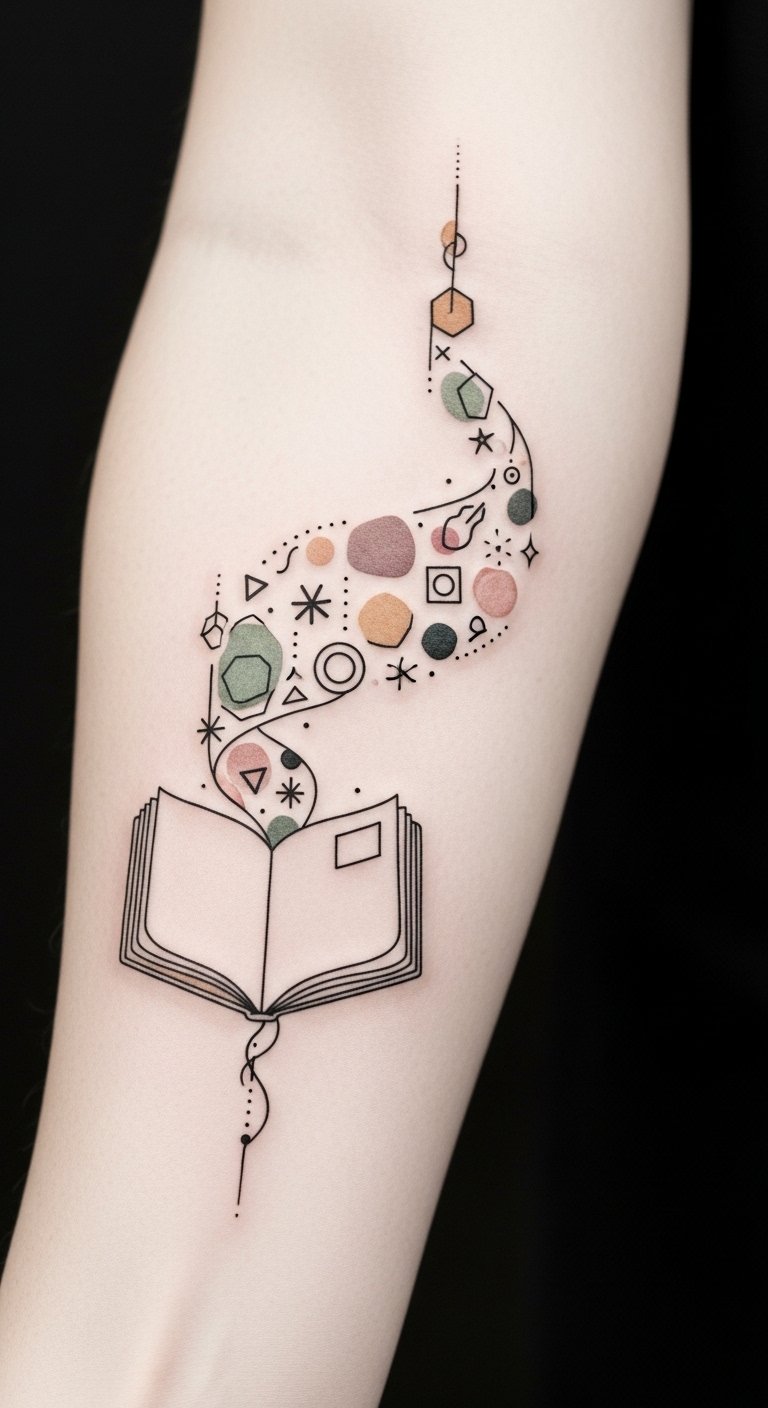 The design symbolizes the ongoing process of self-exploration—an open sketchbook for personal narratives, the ribbon of shapes representing evolving interests and the watercolor accents evoking emotional tones; it feels gentle, intentional, and intimate, suited for a place that can be both concealed and revealed, like the inner forearm or ribcage, allowing the wearer to carry a subtle, personal reminder of growth and authenticity.