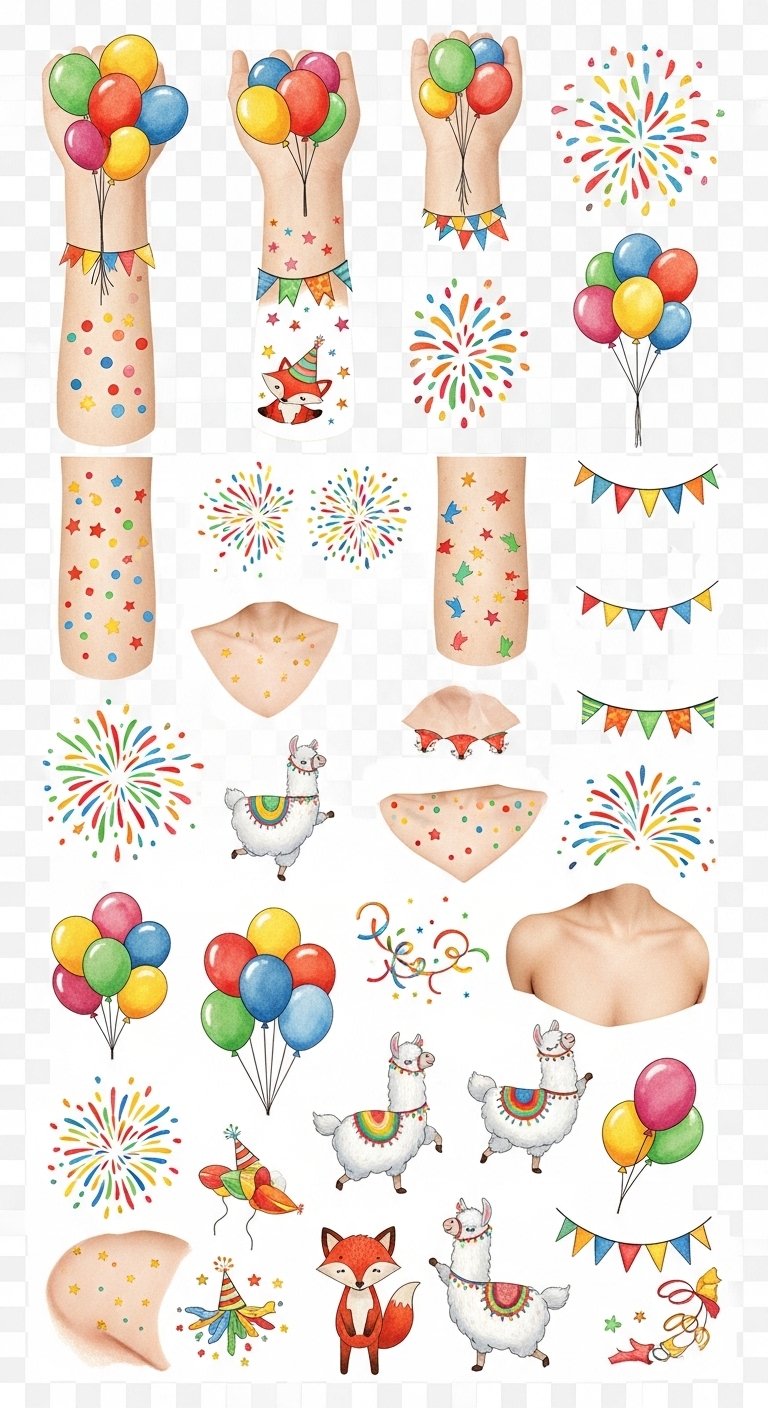These designs symbolize celebration, playfulness, and community—balloons and streamers represent uplift and shared joy. Confetti bursts convey spontaneous excitement, and the whimsical creatures add warmth and friendliness to social gatherings.