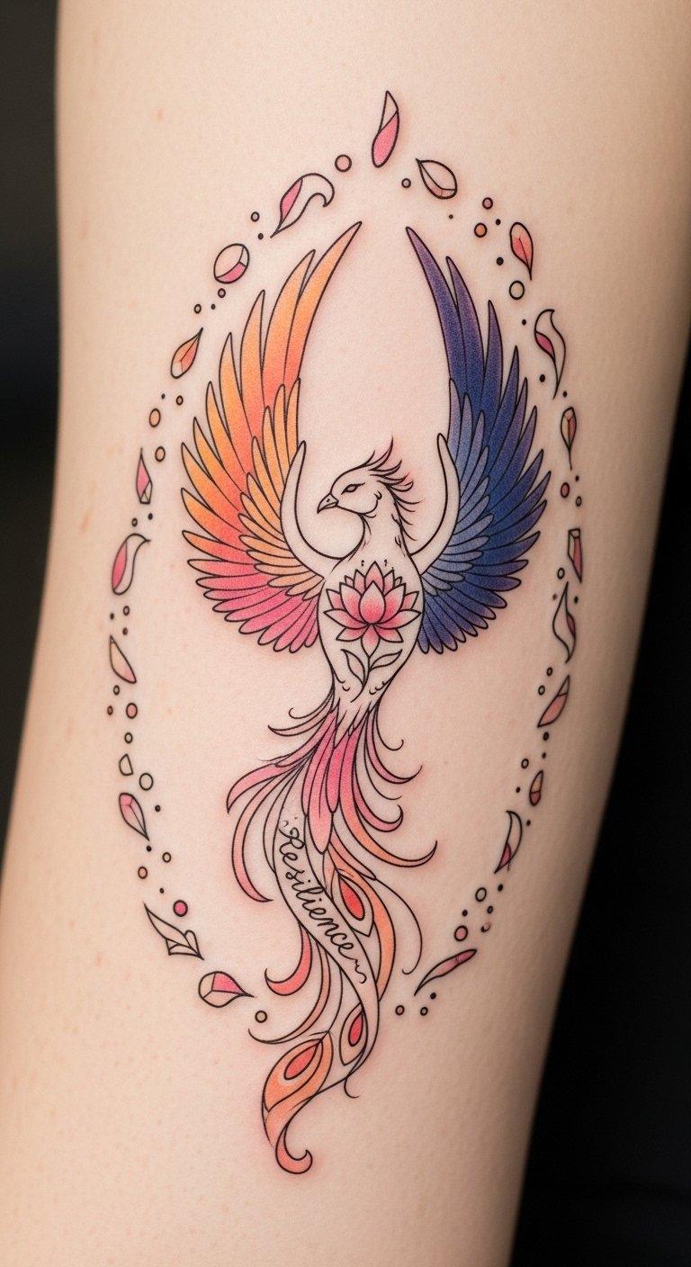These healing art pieces become change reflections, celebrating every step of your evolution toward a freer, more authentic self. The phoenix rising from confetti symbolizes emergence from celebration into renewal—its warm to cool color gradient conveys the emotional arc from joy to introspection; the hidden script and lotus add intimate markers of resilience and rebirth.