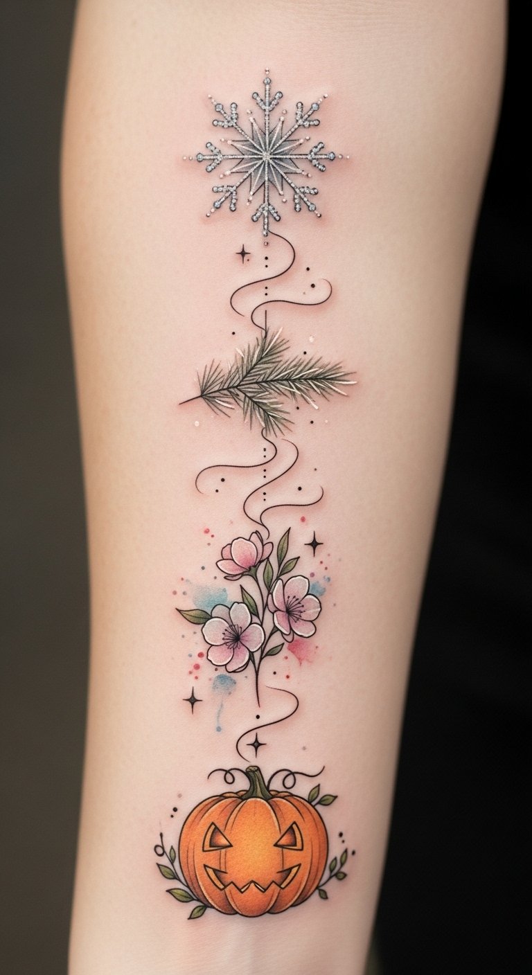 As you wear this seasonal collection down the forearm, each motif captures a distinct mood—winter’s quiet stillness, the evergreen’s steady calm, spring’s renewal, and autumn’s warm playfulness—creating a narrative of life’s cyclical beauty. The vertical placement allows the designs to be viewed individually or as a continuous story; fine linework and muted colors evoke gentle emotion and versatility for both casual and formal visibility, while the connecting flowing line symbolizes continuity and personal growth across changing seasons.