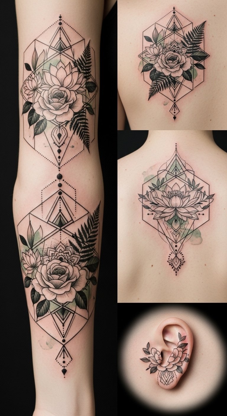 This geometric fusion celebrates floral symmetry, allowing you to express your individuality boldly. Each tattoo becomes a canvas of freedom, intertwining sharp lines with soft petals, inviting you to explore the balance between the rigid and the free-spirited.