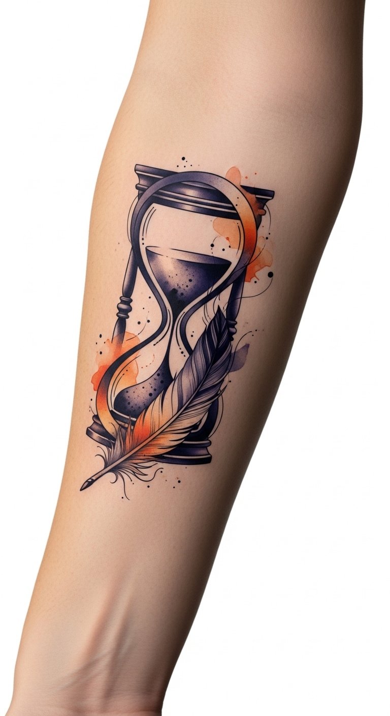 The hourglass symbolizes time’s fleeting moments and the feather represents lightness and freedom; together they convey intentional self-expression and the bravery to change.