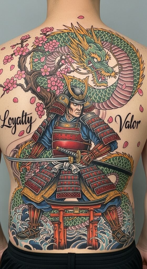 This design places the samurai centrally on the back to convey protective presence.