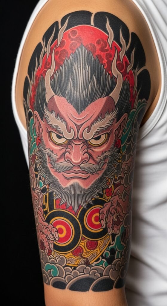 A striking half-sleeve concept that channels the Tengu’s dual nature as protector and wild spirit: the mountain setting and wind motifs convey motion and freedom, the bold blacks and crimsons emphasize strength and heritage while gold accents suggest reverence. Emotionally the design balances fierce guardianship with calm vigilance, giving the wearer a sense of courage and connection to nature; ideal placement wraps the upper arm from shoulder to elbow, curving around the biceps so the Tengu’s gaze follows movement and the pine and cloud elements flow naturally with musculature.