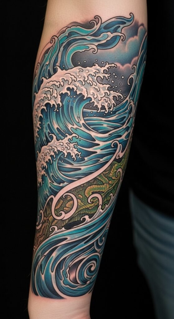 The koi’s vibrant orange and red symbolize perseverance and strength, indigo waves represent resilience and the unknown, emerald leaves suggest growth and renewal, while gold accents add honor and reverence; together these colors evoke determination tempered by cultural respect.