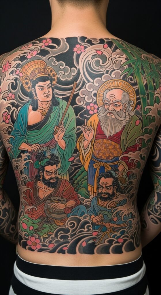 The design uses the Seven Gods of Fortune, known as Shichifukujin, embody a rich tapestry of prosperity, luck, and joy in Japanese culture, making them a popular choice for Yakuza tattoos.