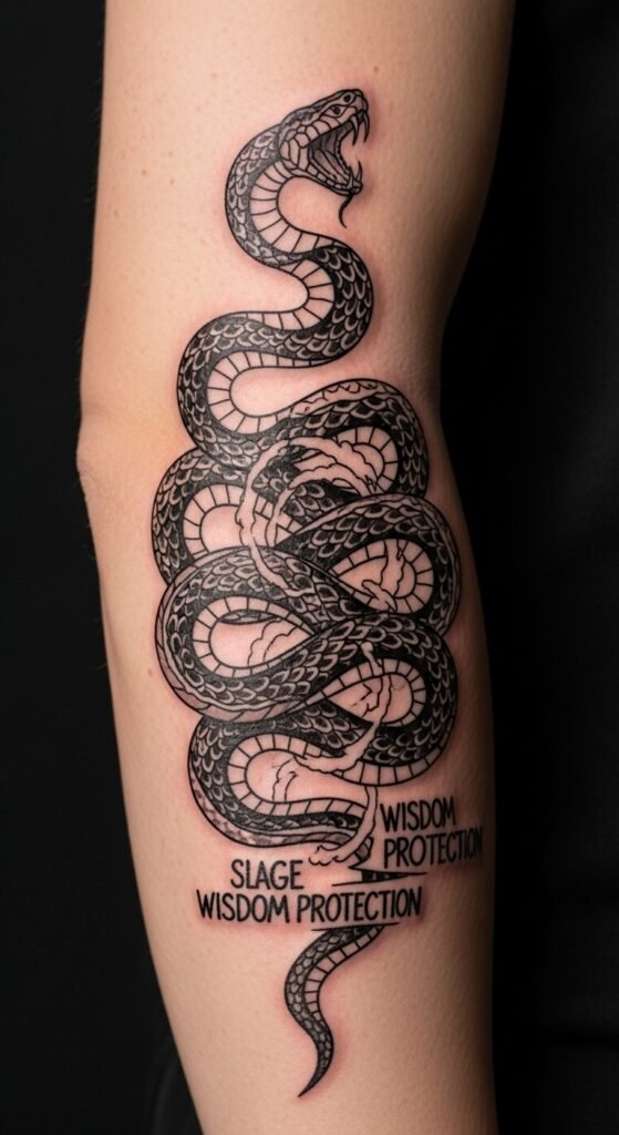 This design evokes calm confidence and vigilant guardianship—ideal for someone seeking an emblem of inner resilience; place it as an upper arm-to-shoulder wrap where the coil can follow musculature, allowing the snake’s motion to read in profile and the protective crest to sit over the deltoid.