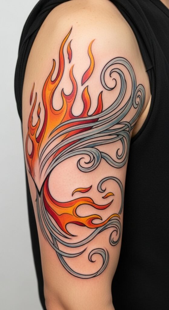 Flame symbolism ignites passion and strength, while wind dynamics represent freedom and change manifestation. Together, they create a harmonious elemental balance, reflecting transformative energy that inspires you to embrace your journey, showcasing your resilience and the power you hold within.