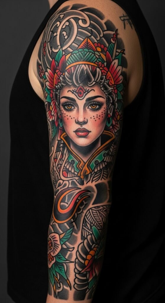 Place the design along the upper back or as a full sleeve to allow the wings and flowing feathers to follow the body’s natural lines, conveying motion and emotional resurgence while integrating traditional motifs for cultural depth.