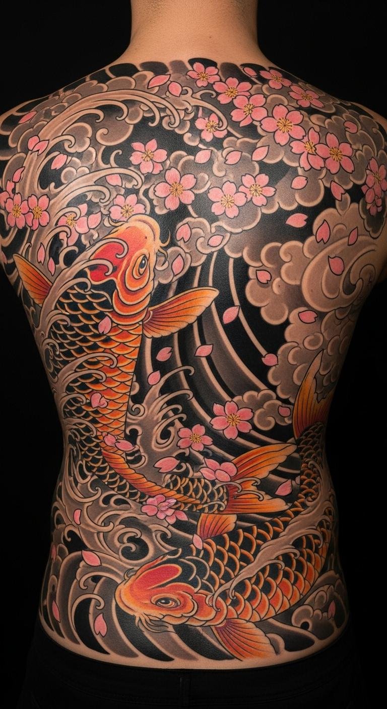 Place this design across the back to allow the koi’s upward motion to travel along the spine toward the shoulder, with blossoms dispersing across the shoulders and upper arms to evoke movement, introspection, and bold personal evolution.