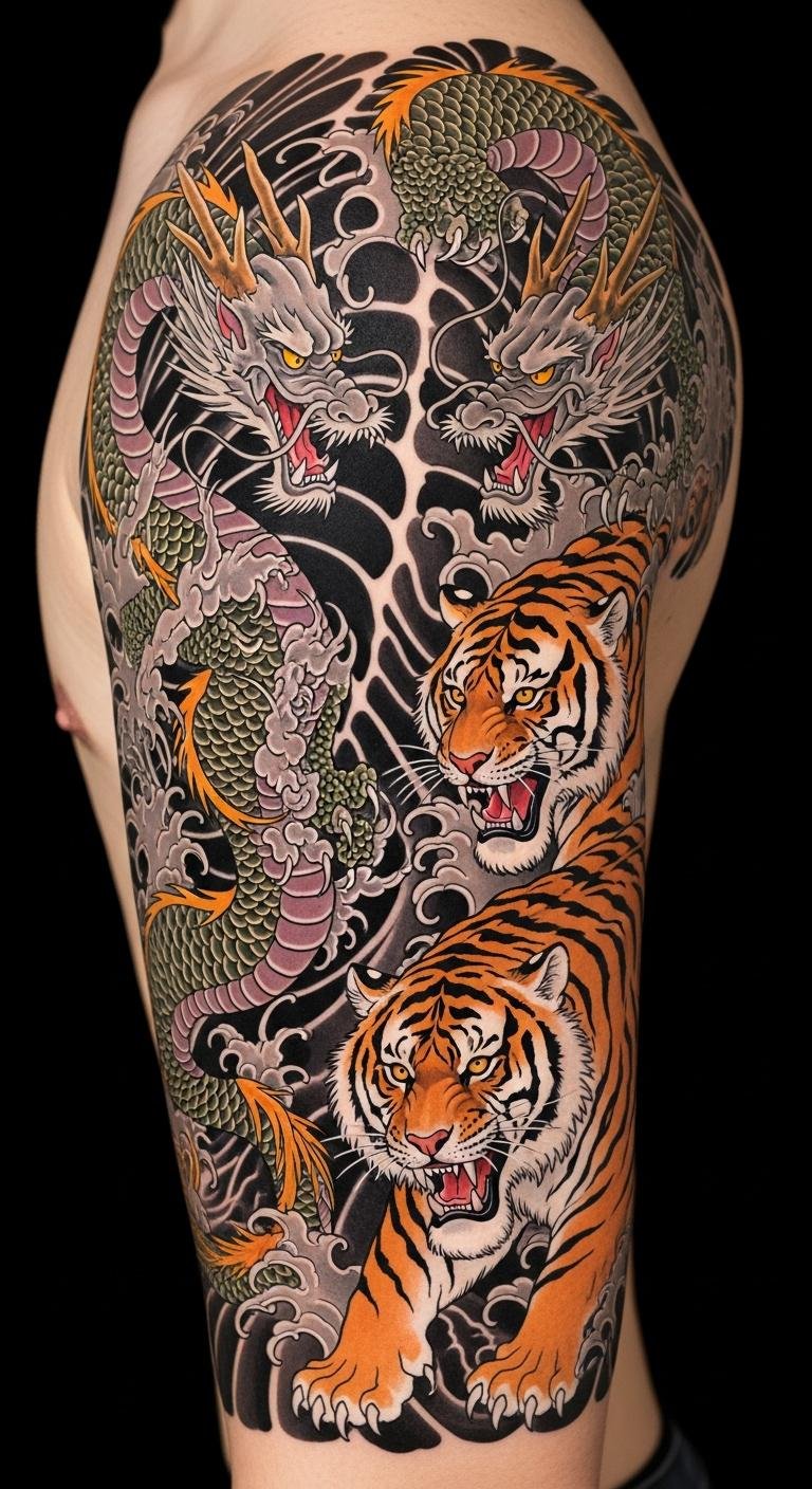 This design channels that narrative: the tiger represents confrontational power and protection, the koi signifies determined progression and growth; placed on the arm or full sleeve it follows muscle lines to convey motion and struggle.