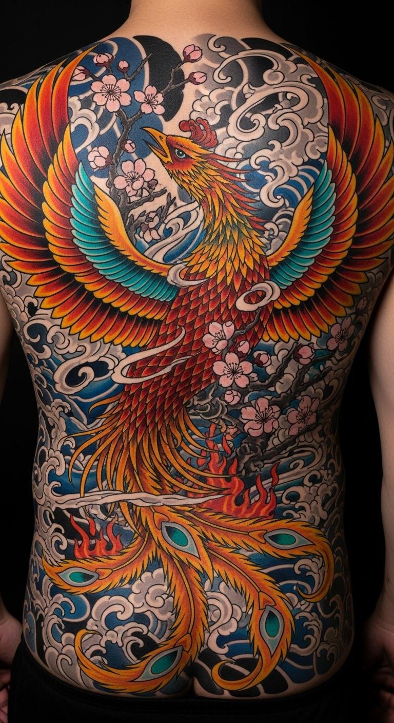 Place centrally on the back to use the spine as a natural axis of ascent; emotion conveyed is fierce determination turning into serene renewal, symbolism layered with waves, blossoms, and lotus to underscore transformation and peace after struggle.